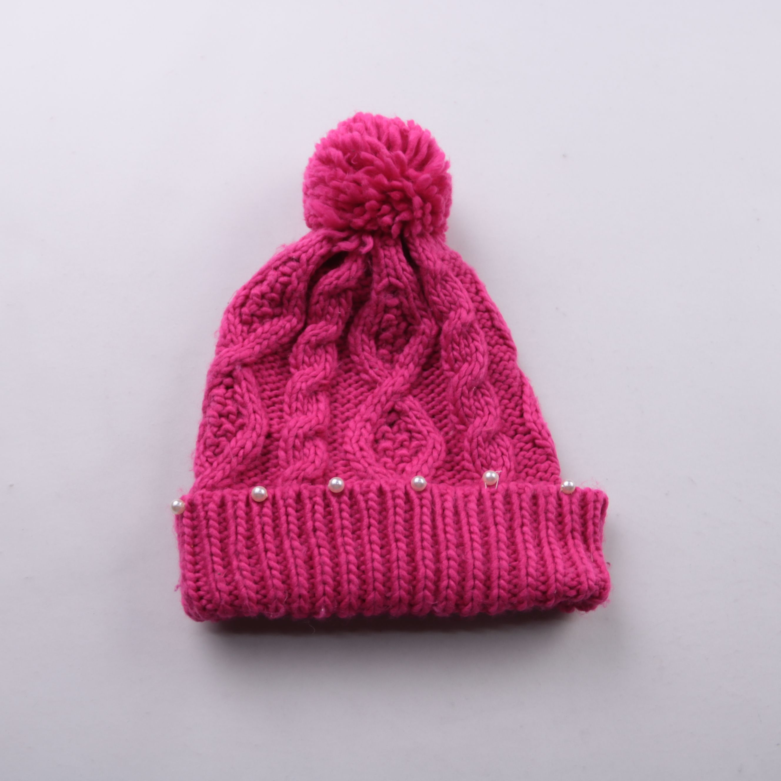 Вязаная шапка бини ярко-розового цвета с помпоном и декоративными бусинами по отвороту. Подойдёт для холодной погоды и зимних прогулок, хорошо смотрится с пуховиком или паркой. Плотная вязка помогает удерживать тепло и закрывает уши за счёт широкого от...