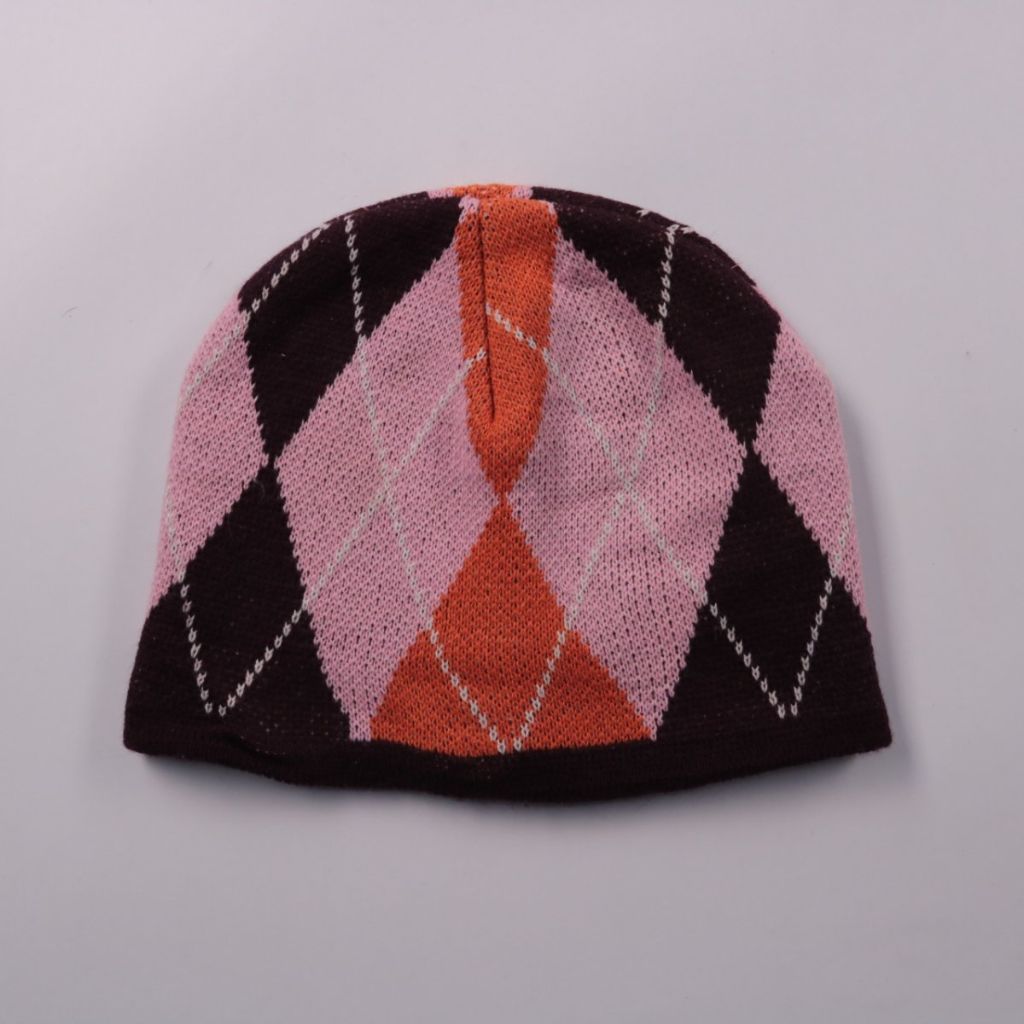 Вязаная шапка с ромбовидным (аргайл) узором в розово-чёрно-оранжевой гамме. Подойдёт для повседневной носки в холодную погоду и на прогулки. Плотная вязка хорошо сохраняет тепло и защищает от ветра.