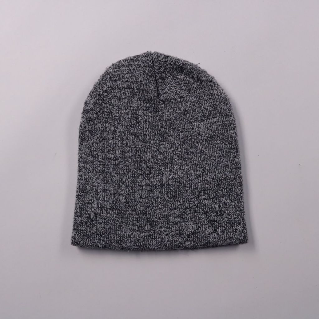 Вязаная шапка-бини серого меланжа без декора, подойдёт для повседневной носки в холодную погоду. Благодаря акрилу в составе хорошо держит форму и быстро сохнет.