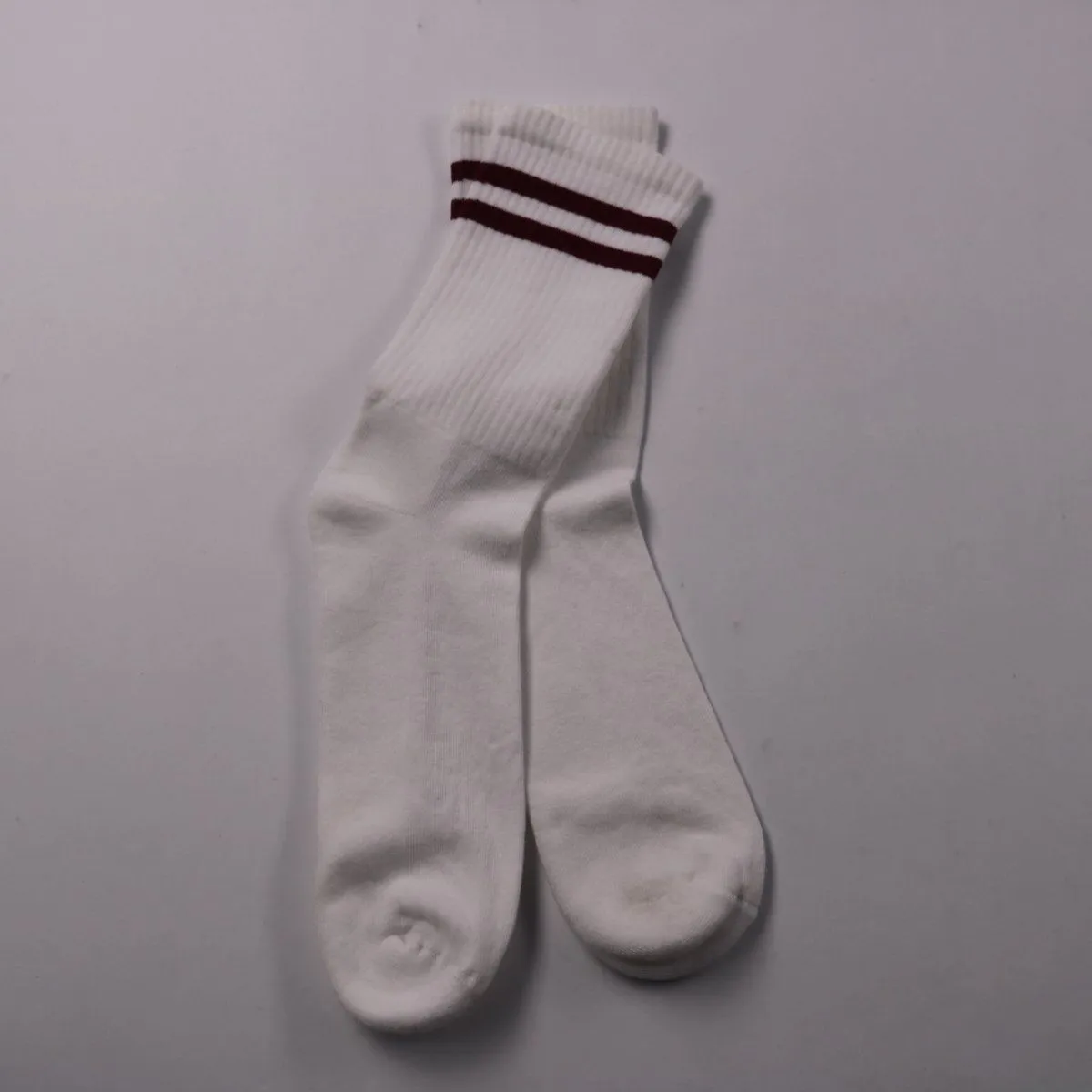 Белые носки в рубчик с двумя бордовыми полосками сверху, подойдут для повседневной носки и спорта. Хорошо сочетаются с кроссовками и кедами, удобны на прогулку или тренировки. Эластичная манжета помогает носкам держаться на ноге и не сползать.