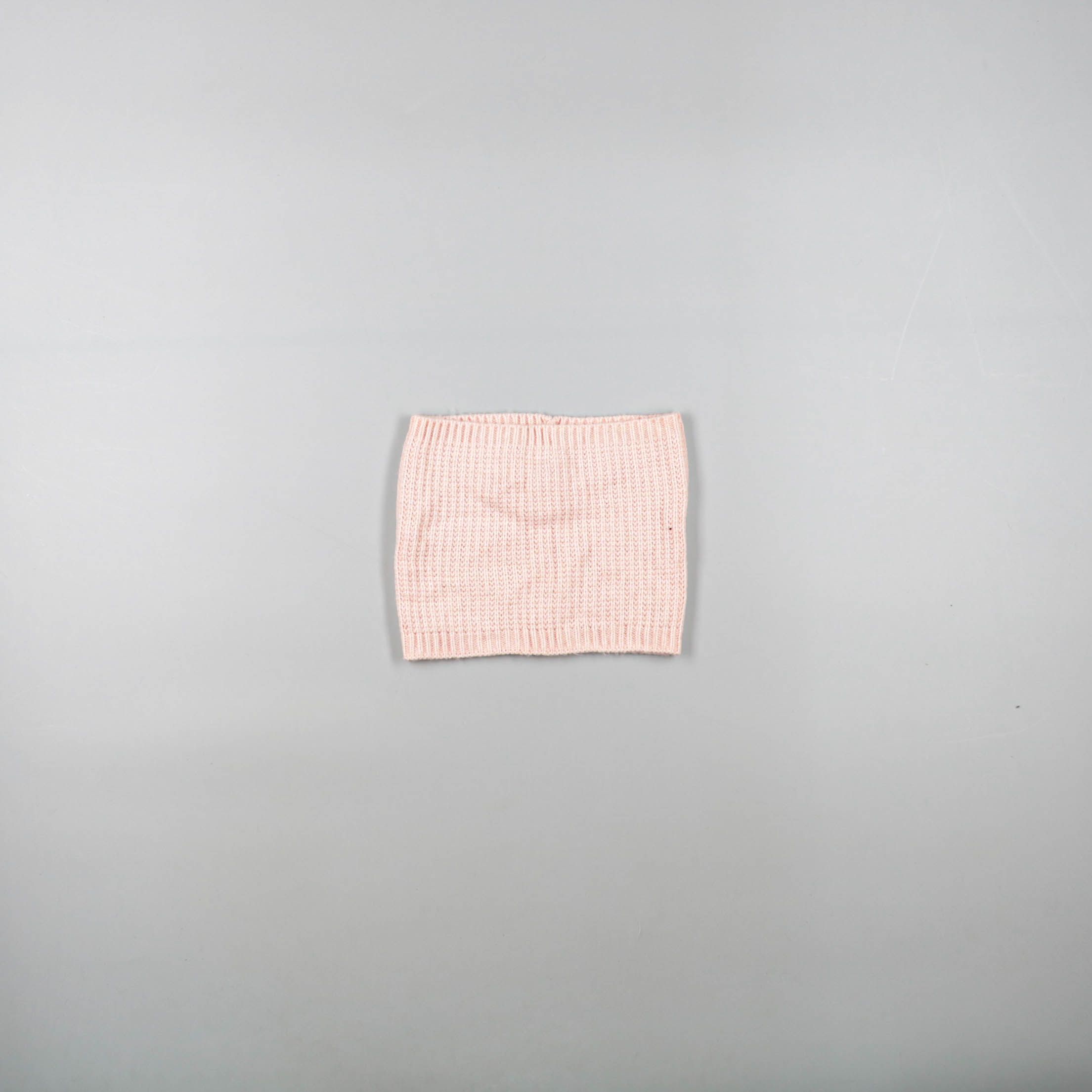 Вязаный снуд нежно-розового цвета без бренда. Подойдёт для зимних прогулок и на прохладную погоду, мягко закрывает шею и легко комбинируется с курткой или пальто. Удобен тем, что не развязывается и быстро надевается через голову.
