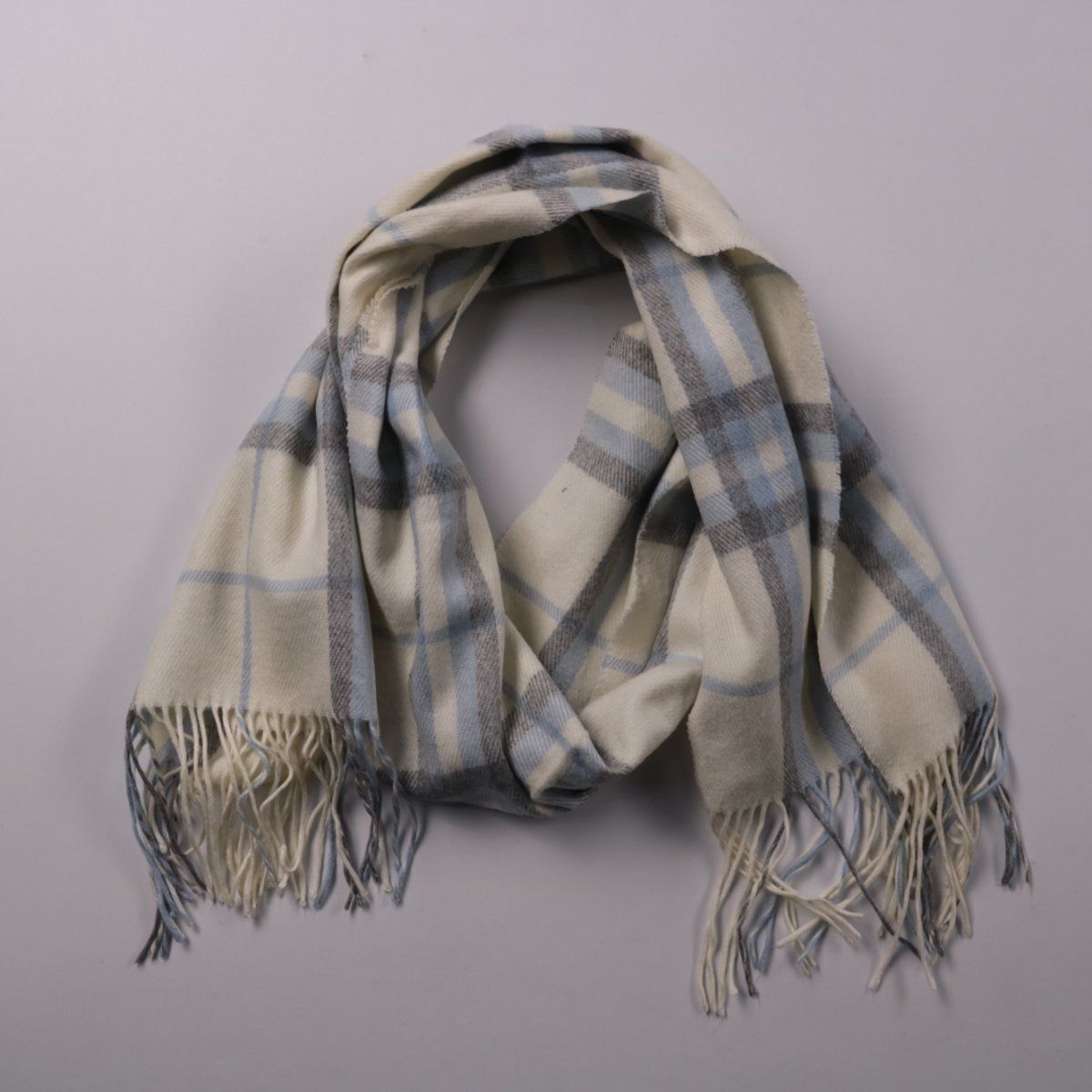 Шарф в клетку в бежево-серой гамме с голубыми полосами и бахромой. Подойдёт для повседневных образов в холодное время года и в межсезонье. Хорошо согревает и легко сочетается с верхней одеждой нейтральных оттенков.