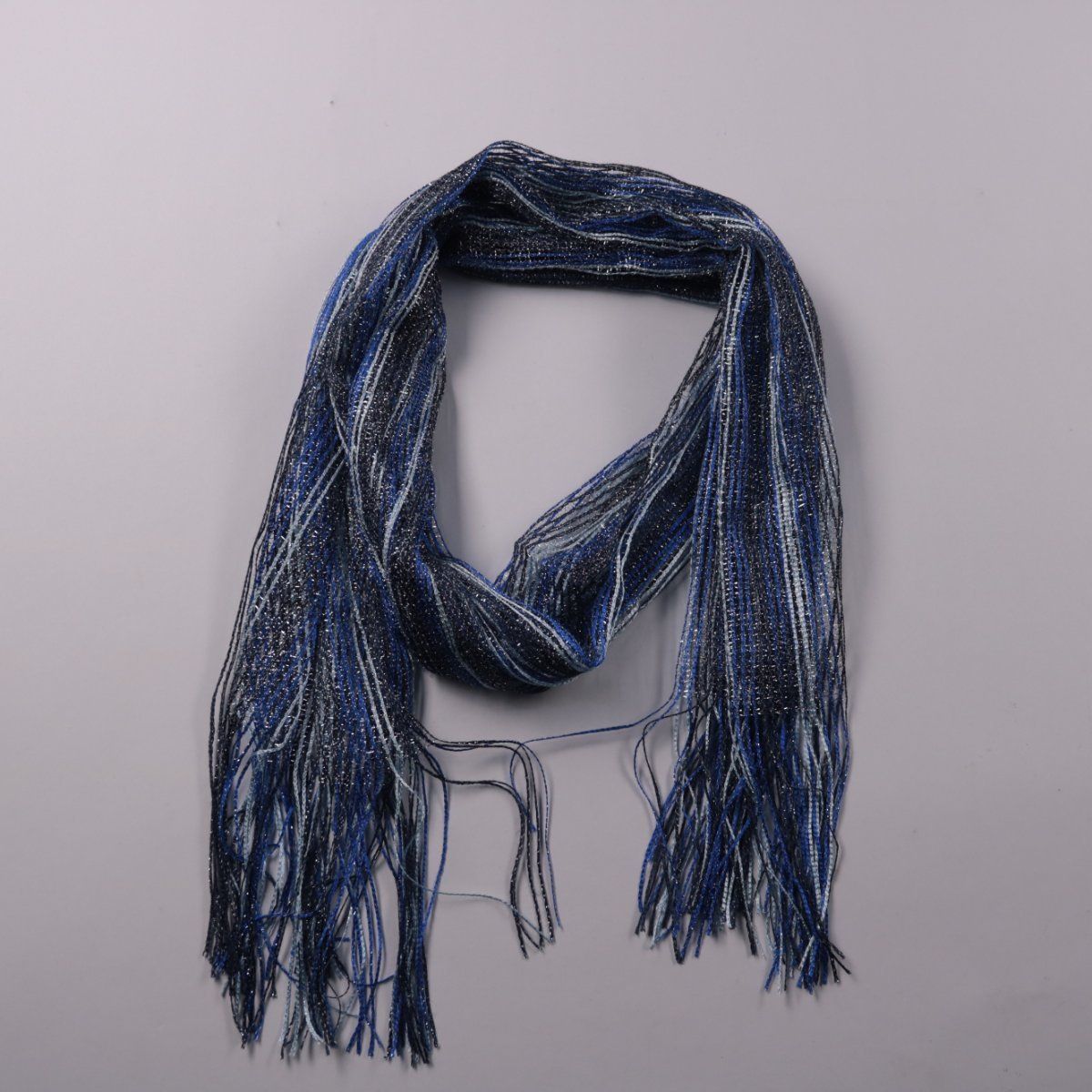 Шарф без бренда в сине-серой гамме с полосками и бахромой. Подойдёт для повседневных образов в прохладную погоду, легко сочетается с пальто и куртками. За счёт длины удобно оборачивается вокруг шеи и хорошо защищает от ветра.