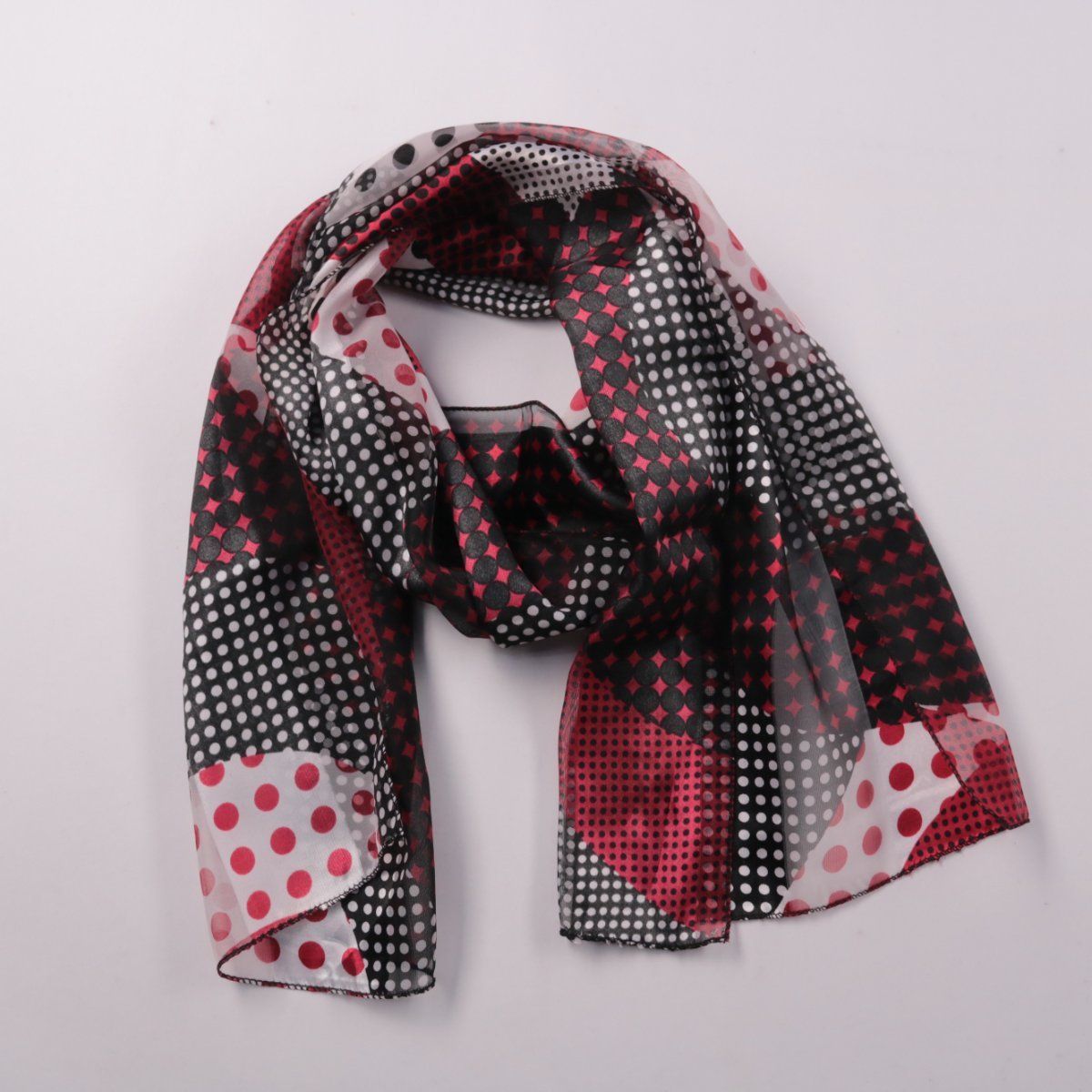 Лёгкий платок с геометрическим принтом в горох (красный, чёрный, белый). Подойдёт для повседневных образов: можно носить на шее, на голове или завязать на сумке. Тонкая ткань компактно складывается и удобно драпируется.