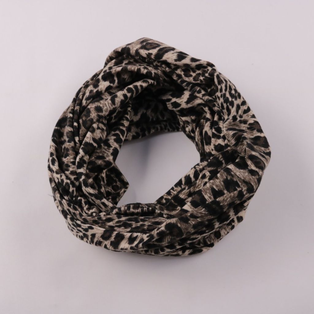 Шарф-снуд с леопардовым принтом, бренд не указан. Подойдёт для повседневных образов и как акцент к однотонной верхней одежде. Удобен тем, что носится петлёй и не развязывается на ветру.