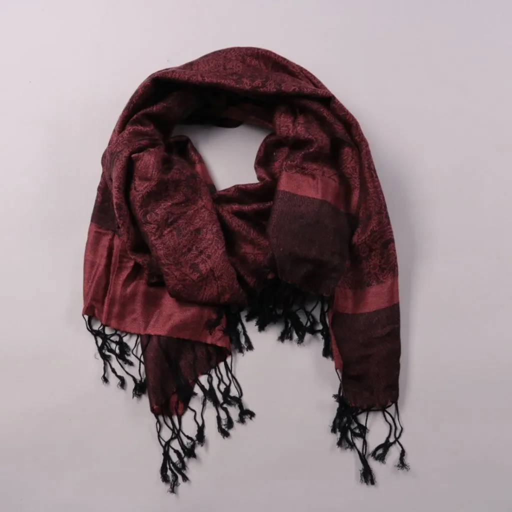 Шарф с жаккардовым узором и кисточками по краю, без указания бренда. Подойдёт для повседневных образов в прохладную погоду и в поездках. Лёгкая ткань удобно драпируется и компактно складывается в сумку.