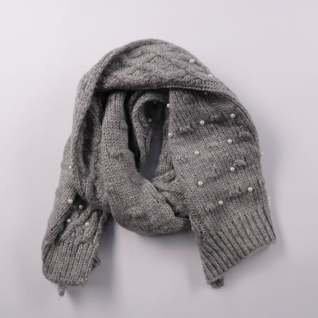 Вязаный шарф-снуд Savida серого цвета с узором «косы» и декором из бусин. Подойдёт для повседневных зимних образов и для прогулок в прохладную погоду. Объёмная вязка хорошо сохраняет тепло и удобно сидит вокруг шеи.