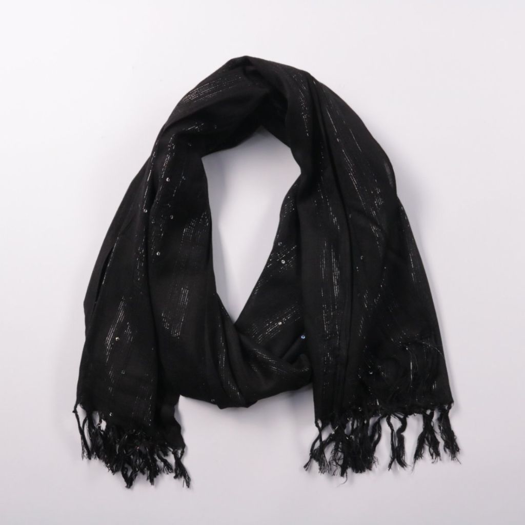 Лёгкий чёрный шарф с бахромой и деликатным мерцающим рисунком по ткани. Подойдёт для повседневных образов и вечерних выходов как накидка на плечи или аксессуар на шею. Тонкий материал удобно складывается и не занимает много места в сумке.