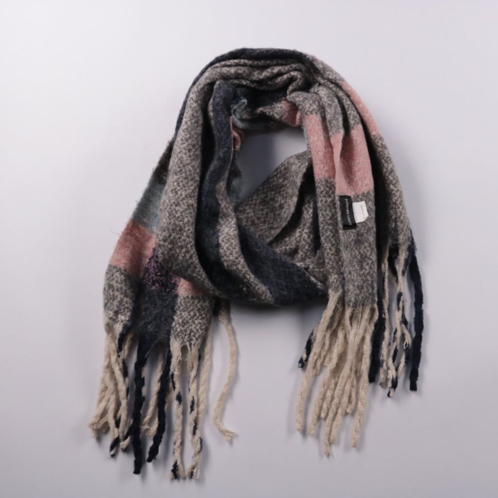 Шарф James Lakeland в клетку с бахромой, выполнен в серо-сине-розовой гамме. Подойдёт для повседневных зимних образов и утепления в прохладную погоду. Материал 100% полиэстер — легко стирается и быстро сохнет.