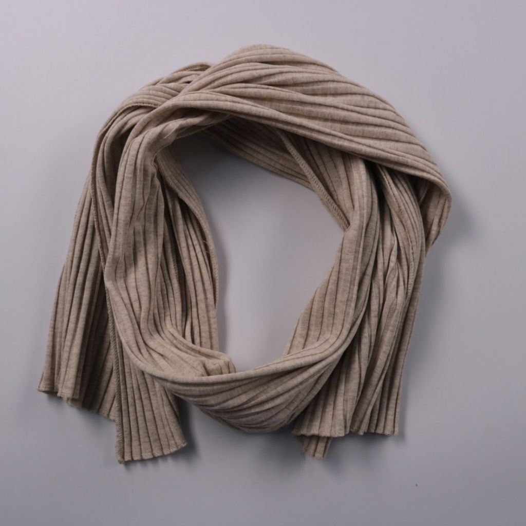 Вязаный шарф в рубчик нейтрального бежевого оттенка, без заметных декоративных элементов. Подойдёт для повседневных образов в холодную погоду и легко сочетается с верхней одеждой разных цветов. Мягкая фактура и длинный формат позволяют удобно наматыват...