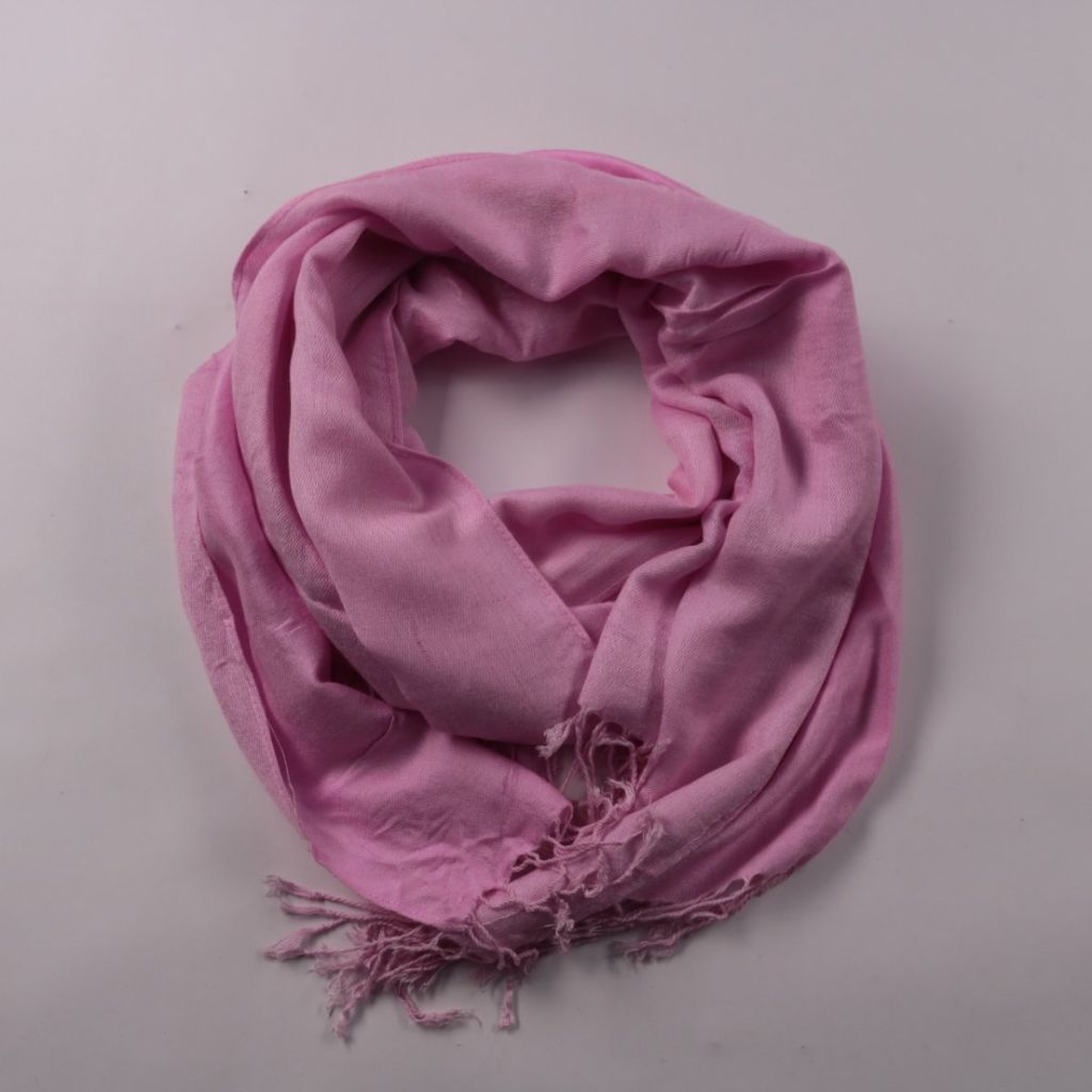 Шарф без бренда нежно-розового цвета с бахромой по краю. Подойдёт для повседневных образов в прохладную погоду, можно носить как шарф или лёгкую накидку. Лёгкий материал удобно драпируется и не занимает много места в сумке.