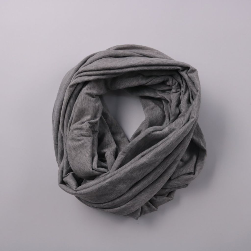 Шарф-снуд Gina Tricot из мягкого трикотажа серого цвета. Подойдёт для прогулок и повседневных образов в прохладную погоду, удобно носить в один или два оборота. Практичен тем, что компактно складывается и легко сочетается с верхней одеждой.