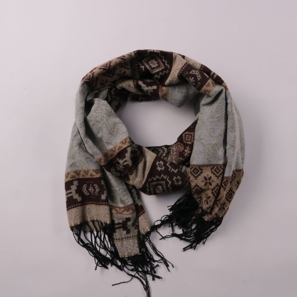 Шарф с геометрическим узором и кисточками по краю, без указания бренда. Подойдёт для повседневной носки в прохладную погоду и легко сочетается с базовой верхней одеждой. За счёт длины его удобно завязывать разными способами и использовать как дополните...