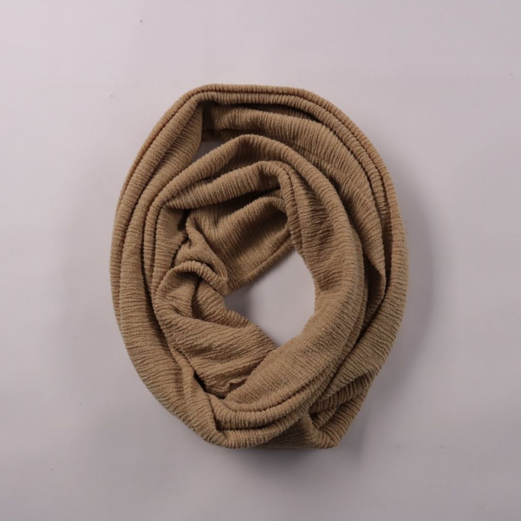 Шарф-снуд бежевого цвета из фактурного трикотажа. Подойдёт для повседневной носки в прохладную погоду и легко сочетается с верхней одеждой. Удобен тем, что надевается одним движением и не развязывается.