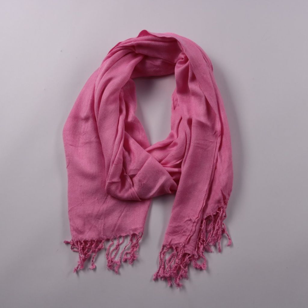 Лёгкий шарф без бренда в розовом цвете с декоративной бахромой по краям. Подойдёт для повседневных образов и как акцент к пальто, куртке или платью в прохладную погоду. Удобно драпируется и занимает мало места в сумке.