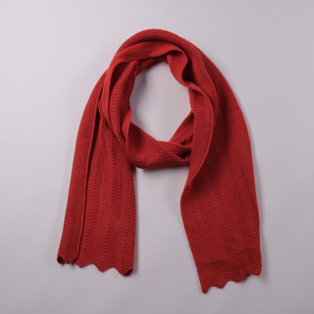 Вязаный шарф Viyella из 100% мериносовой шерсти, красного цвета с фактурным узором «ёлочка». Подойдёт для повседневных образов и прогулок в холодную погоду. Меринос хорошо сохраняет тепло и при этом остаётся мягким к коже.