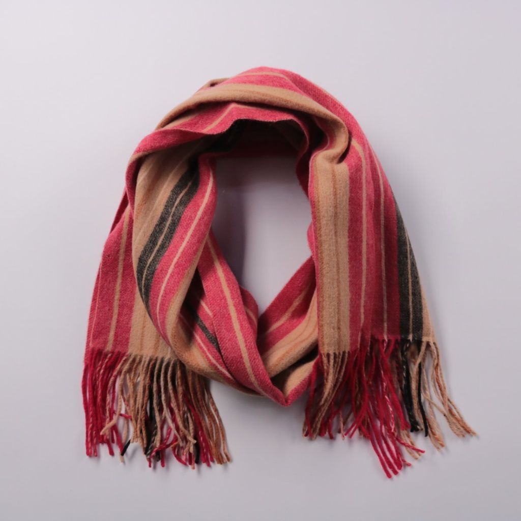 Шарф в полоску без указанного бренда, в красно-бежевой гамме с бахромой по краю. Подойдёт для прохладной погоды и легко сочетается с однотонной верхней одеждой. Практичное преимущество — мягкое полотно хорошо укрывает шею и даёт дополнительное тепло.