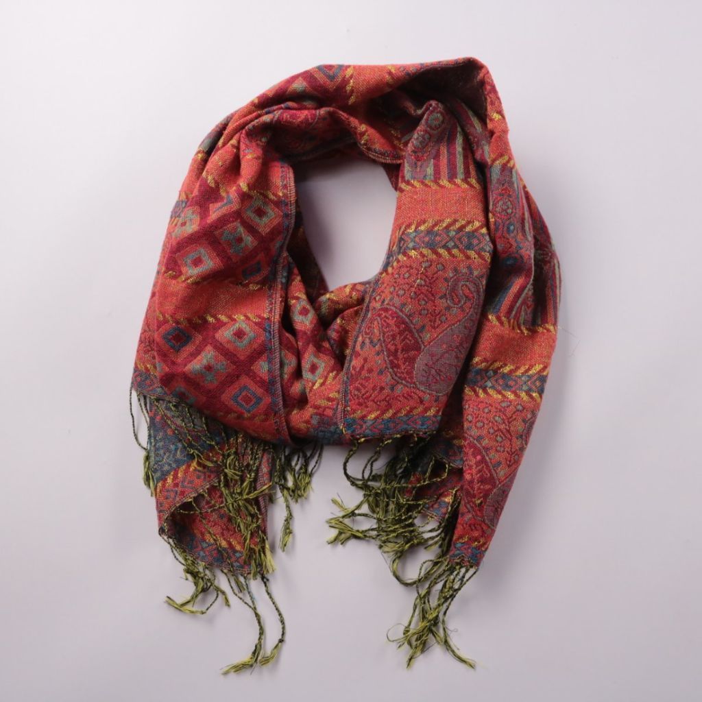 Шарф с этническим узором и кисточками по краям, без указанного бренда. Подойдёт для прогулок и повседневных образов в прохладную погоду, можно носить как шарф или накидывать на плечи. Практичен тем, что добавляет тепла и легко сочетается с базовой верх...