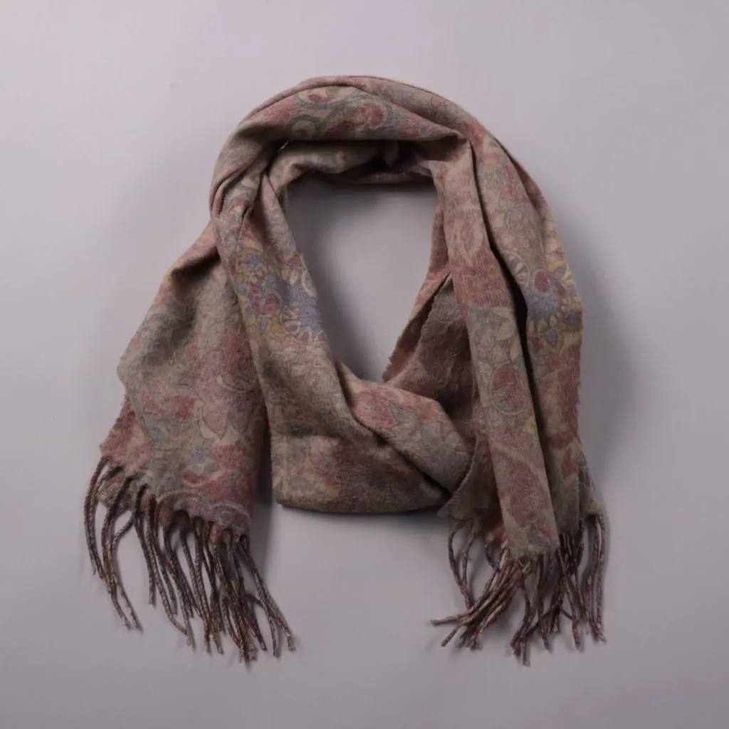 Шарф с кисточками и узором пейсли в спокойной разноцветной гамме. Подойдёт для повседневных образов и для прохладной погоды в межсезонье. Легко драпируется и добавляет тепла без лишнего объёма.