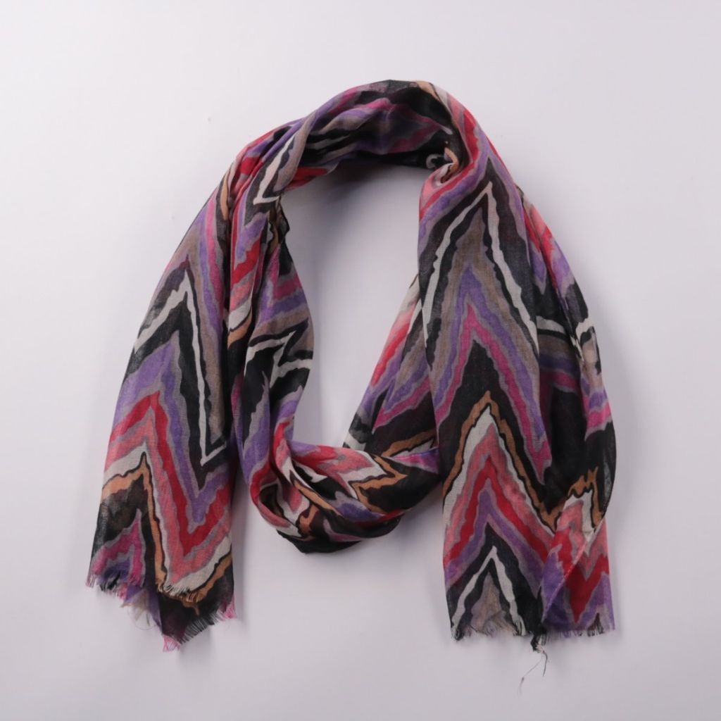 Лёгкий шарф с зигзагообразным принтом в фиолетово-красно-чёрной гамме и необработанными краями. Подойдёт для демисезона и прохладных вечеров, легко сочетается с базовой верхней одеждой. Компактно складывается и удобно брать с собой.