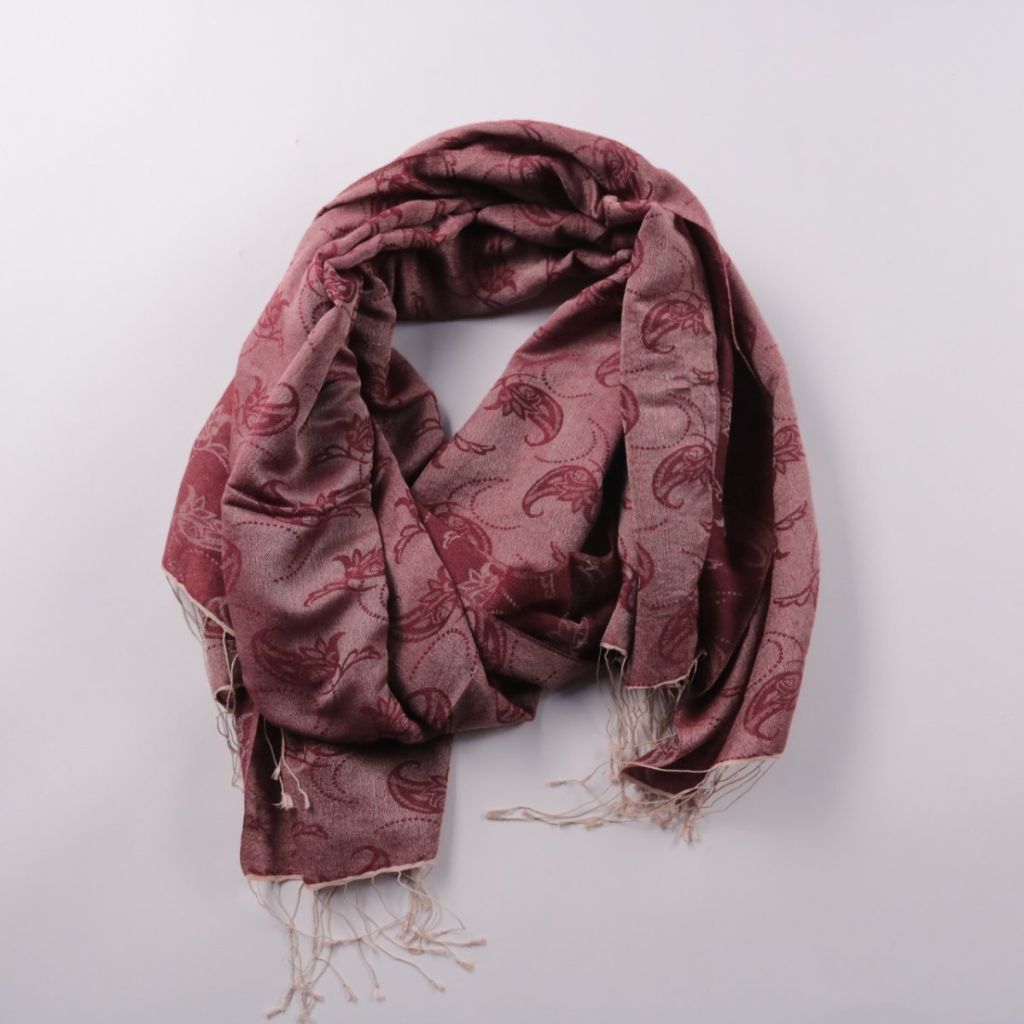 Шарф с узором пейсли в бордово-розовой гамме и декоративной бахромой по краям. Подойдёт для демисезона и прохладных вечеров, хорошо сочетается с пальто, курткой или трикотажем. Лёгкий и компактный, удобно брать с собой и использовать как накидку на плечи.