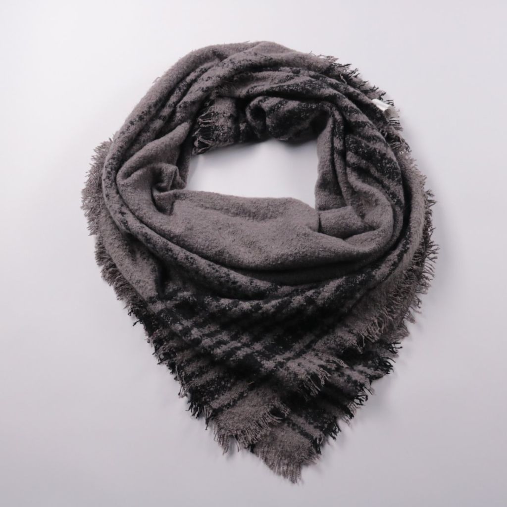 Шарф Review в серо-чёрную клетку с бахромой по краю. Подойдёт для повседневных образов в холодную погоду, можно носить как шарф или накидывать на плечи. Мягкий материал не колется и легко драпируется.