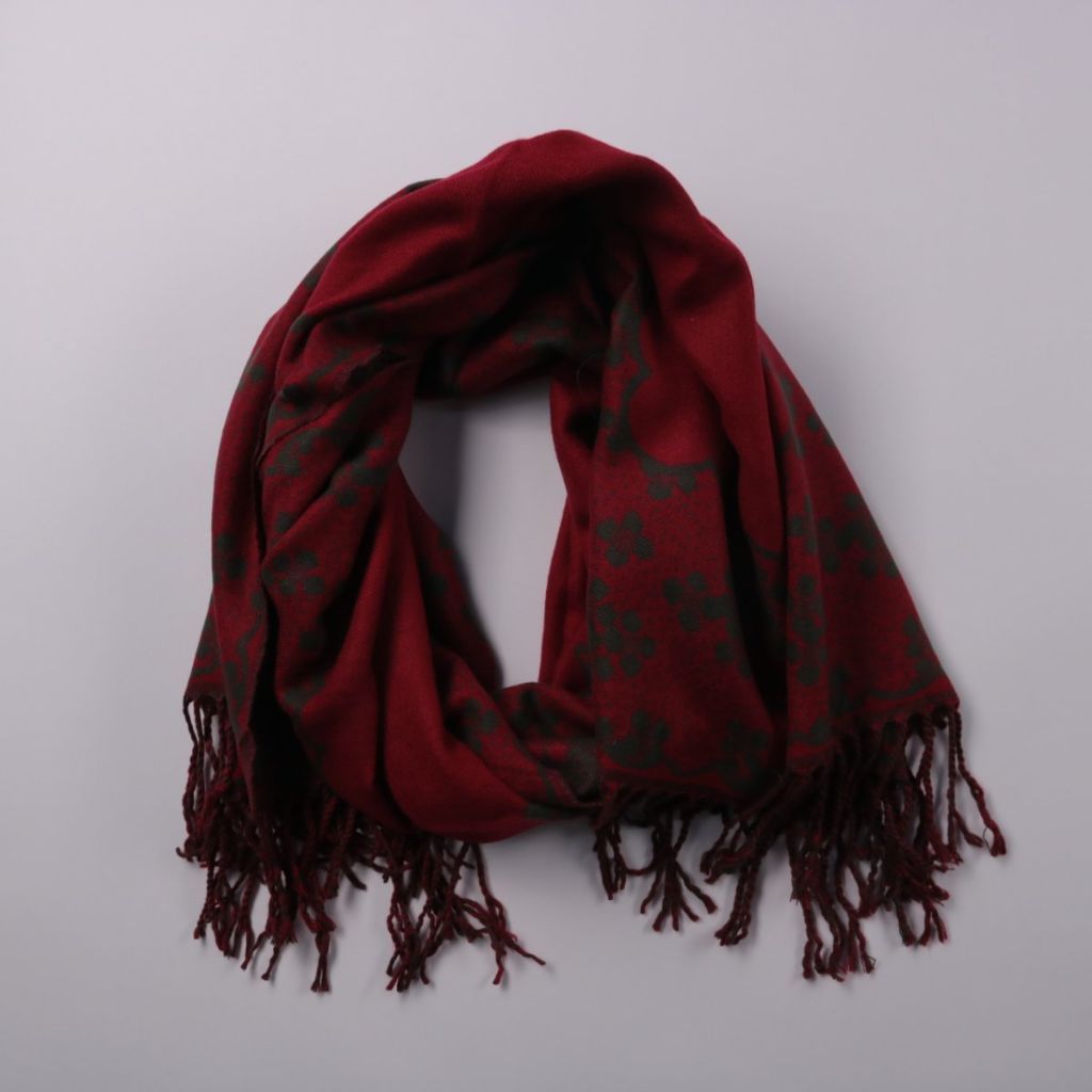 Шарф с бахромой и узором в бордово-чёрной гамме, бренд не указан. Подойдёт для повседневных образов в прохладную погоду и как акцент к однотонной верхней одежде. Мягко драпируется и добавляет тепла за счёт плотного полотна.