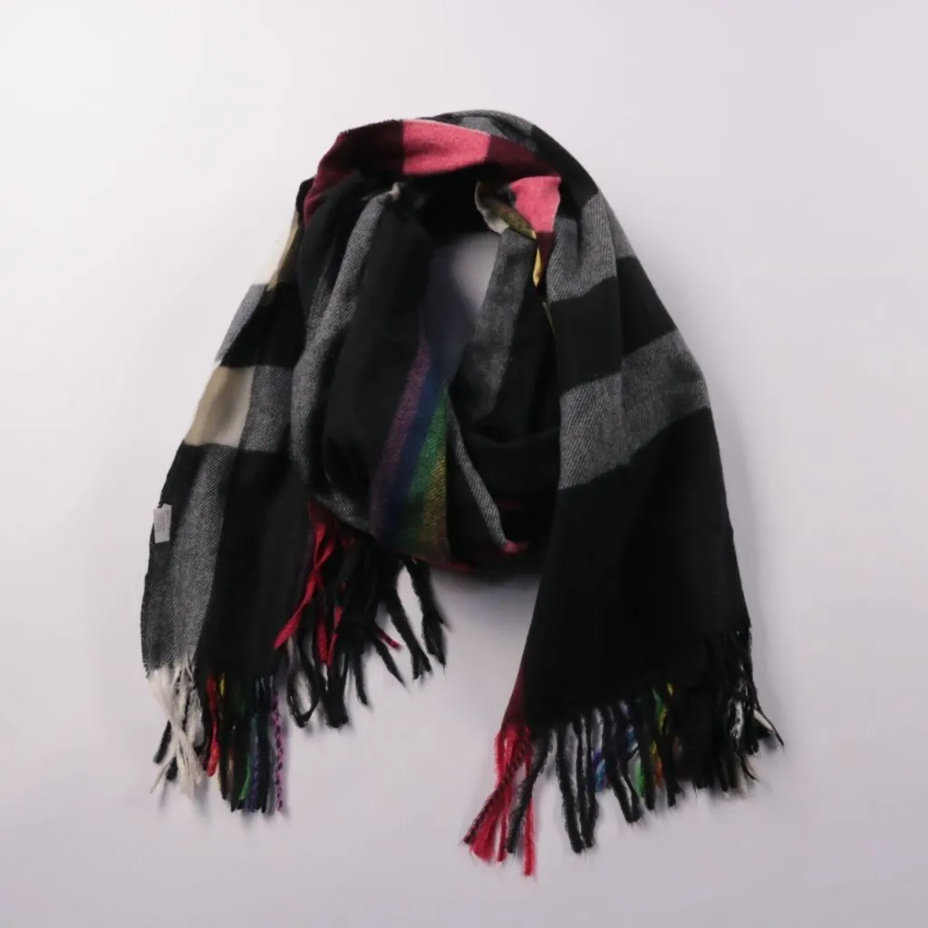 Шарф в клетку с яркой радужной полосой и бахромой по краю. Подойдёт для повседневных образов в городе и поездок в прохладную погоду. Смесь шерсти и вискозы делает его тёплым и при этом достаточно мягким на шее.
