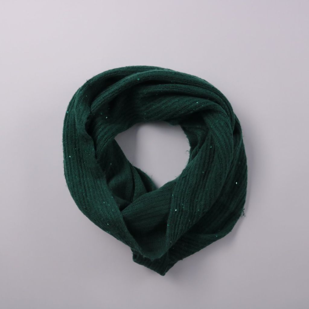 Вязаный шарф-снуд без бренда, выполнен в тёмно-зелёном цвете с лёгким мерцанием. Подойдёт для зимних прогулок и поездок на работу, хорошо закрывает шею от ветра. Удобен тем, что быстро надевается и держит форму без завязывания.