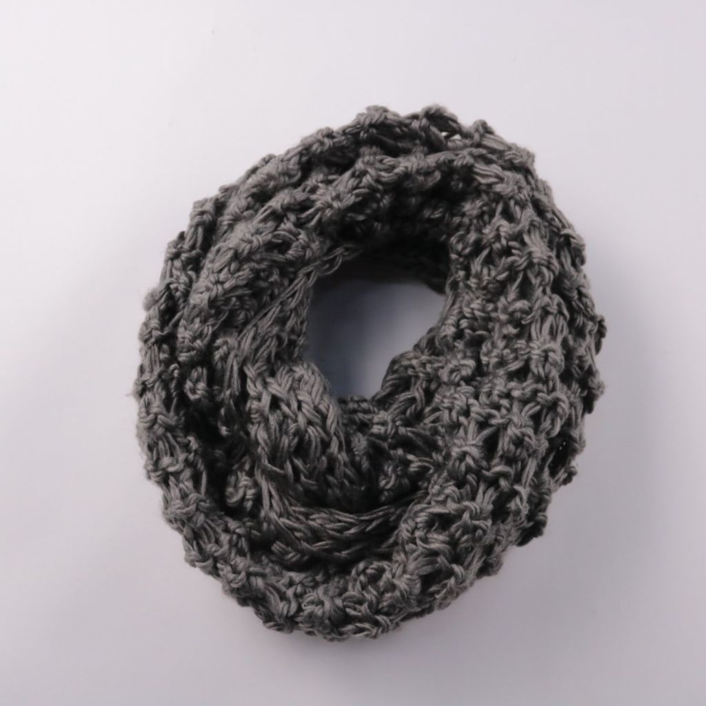 Вязаный снуд без бренда в сером цвете, выполнен крупной фактурной вязкой. Подойдёт для повседневной носки в холодную погоду и легко сочетается с курткой или пальто. Формат «кольцо» удобно надевать и он хорошо закрывает шею от ветра.