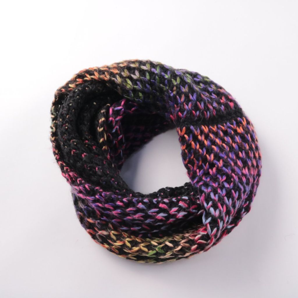 Вязаный шарф-снуд без бренда, выполнен из пряжи с разноцветным меланжевым эффектом. Подойдёт для зимних прогулок и повседневных образов, хорошо закрывает шею от ветра. Удобен тем, что надевается одним движением и не развязывается.