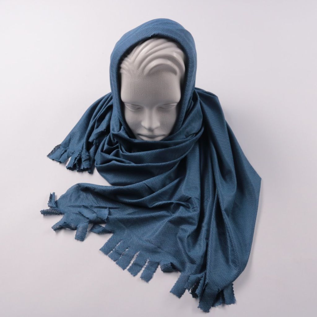 Шарф без указанного бренда, однотонный синий, с декоративной бахромой по краям. Подойдёт для повседневных образов и как накидка на плечи в прохладную погоду. Легко драпируется и компактно складывается.