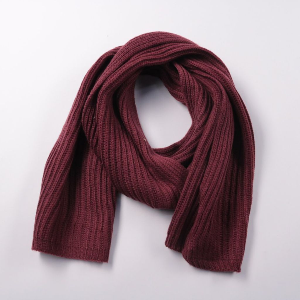 Вязаный шарф в рубчик бордового цвета без видимого брендинга. Подойдёт для повседневных образов и прогулок в холодную погоду, хорошо сочетается с пальто и пуховиками. Практичен тем, что длинный и легко завязывается разными способами, закрывая шею от ве...