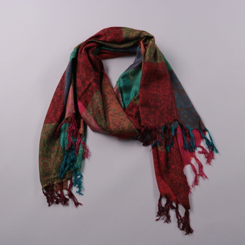 Шарф с кисточками и узорным жаккардовым плетением в стиле пэчворк, без указания бренда. Подойдёт для повседневных образов и поездок, чтобы добавить цветовой акцент. Кисточки по краям помогают красиво драпировать и фиксировать шарф на узле.