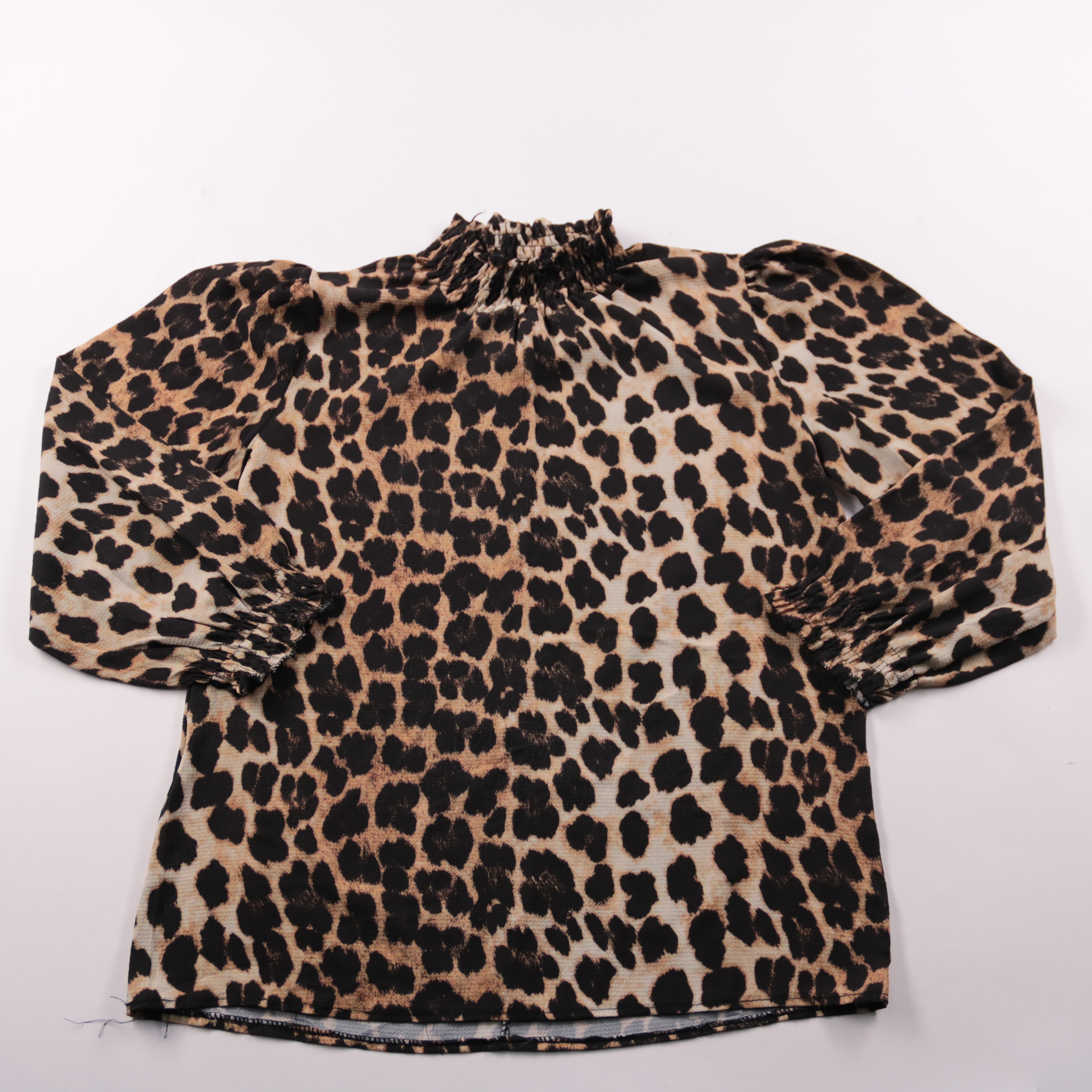 Детская блузка с леопардовым принтом и высоким присборенным воротником, рукава на мягкой резинке. Подойдёт для школы, праздников и повседневных образов в любое время года. Лёгкая ткань удобно сидит и не сковывает движения.