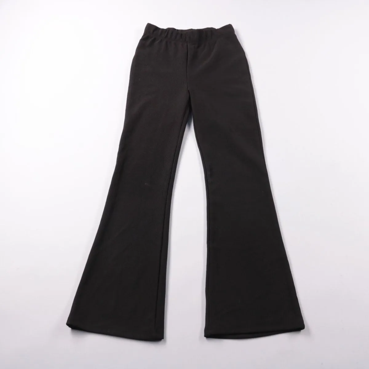 Брюки Primark для девочки чёрного цвета, расклешённые книзу и на эластичном поясе. Подойдут для повседневной носки и для более нарядных образов с блузкой или свитшотом. Резинка на талии обеспечивает удобную посадку и быстрое переодевание.