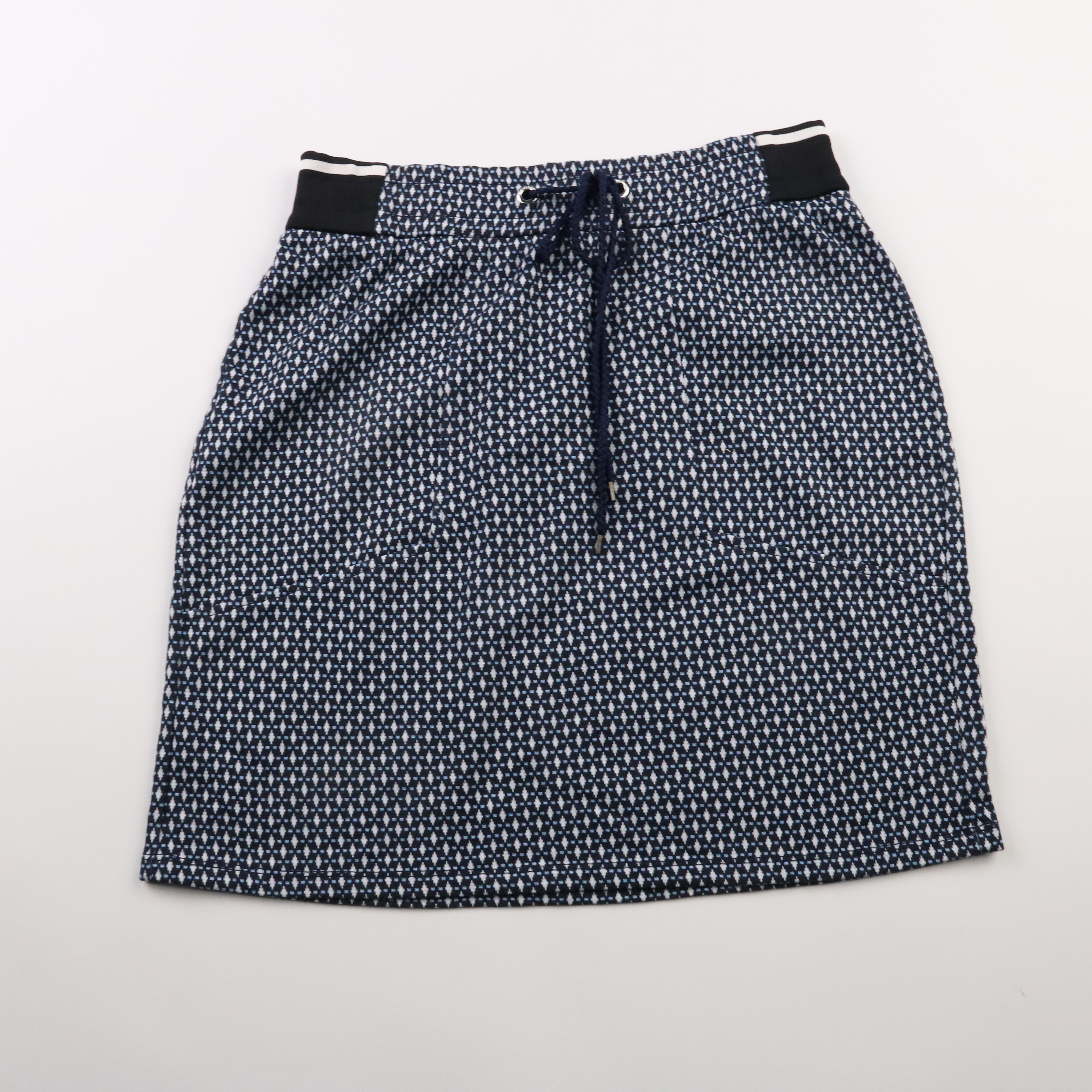 Юбка для девочки из плотного трикотажа тёмно-синего цвета с мелким белым рисунком и шнурком на поясе. Подойдёт для школы и прогулок, легко сочетается с однотонными футболками и кофтами. Эластичный пояс обеспечивает удобную посадку и комфорт в движении.
