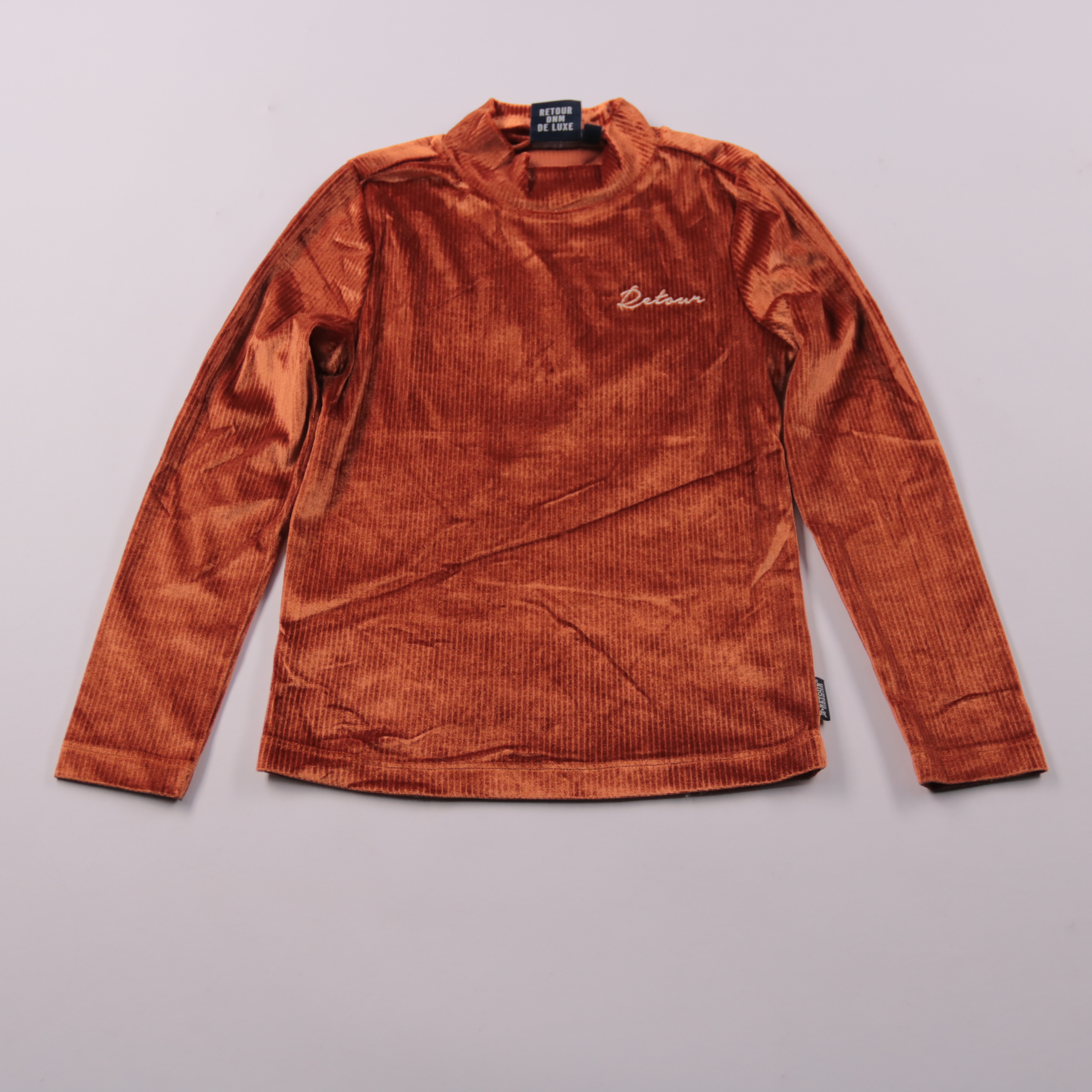 Кофта Retour из мягкого велюра/бархата в кирпично-рыжем цвете, с небольшим логотипом на груди и воротником-стойкой. Подойдёт для школы и повседневной носки в прохладную погоду, удобно носить как самостоятельный слой или под жилет/куртку. Материал тянет...