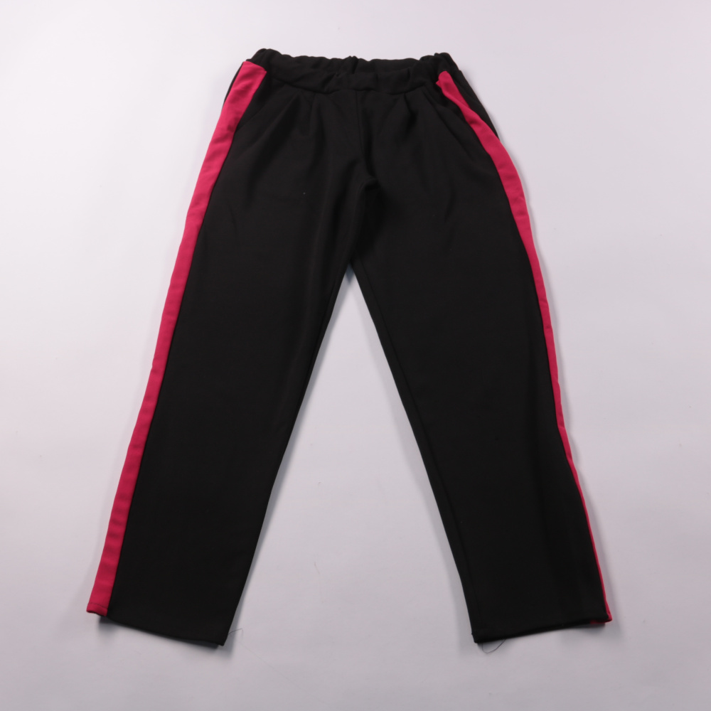 Детские брюки из 100% полиэстера, чёрного цвета с розовыми лампасами по бокам. Подойдут для повседневной носки и занятий спортом в саду или школе. Материал лёгкий и быстро сохнет после стирки.