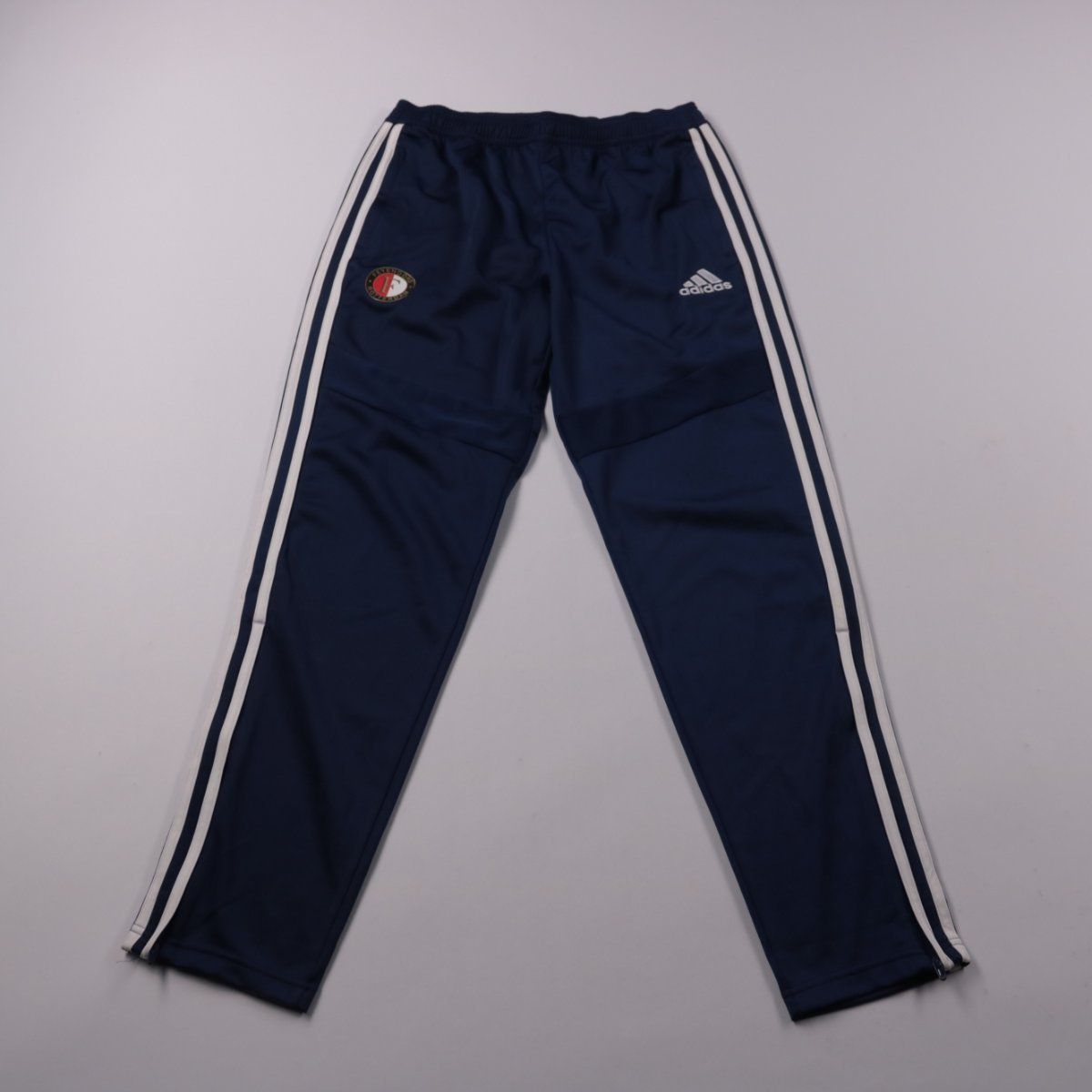 Спортивные брюки Adidas тёмно-синего цвета с белыми лампасами и эластичным поясом. Подойдут мальчику для тренировок, физкультуры и повседневной носки, внизу есть молнии для удобства надевания. Материал из 100% полиэстера быстро сохнет и прост в уходе.
