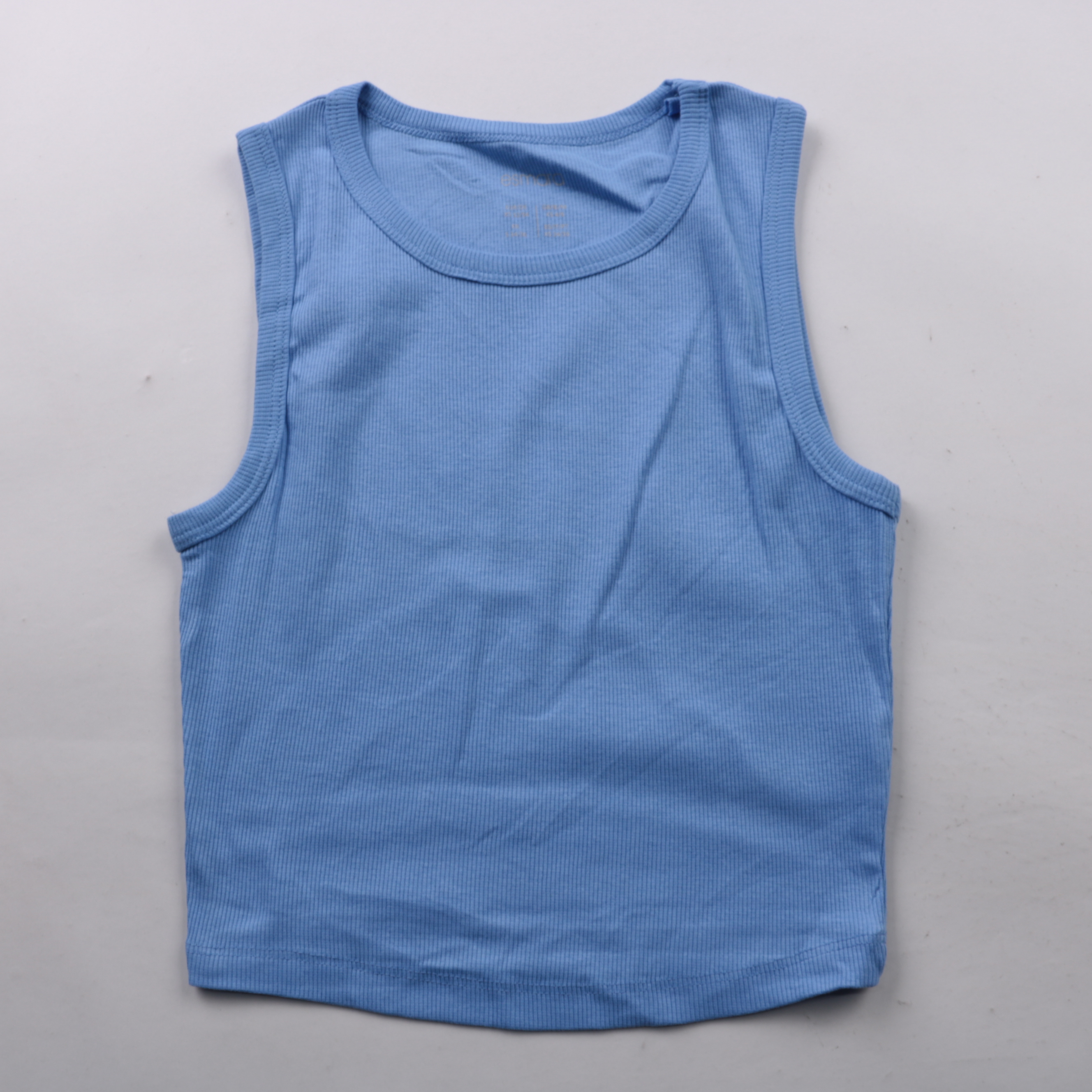 Детская майка в рубчик голубого цвета, без указания бренда. Подойдёт для лета, дома, садика и активных игр. Тянется за счёт эластана и не сковывает движения.
