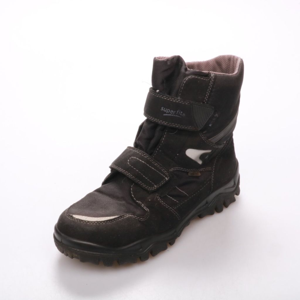 Детские ботинки Superfit чёрного цвета на липучках, с высоким голенищем и плотной подошвой с протектором. Подойдут для зимних прогулок и активных игр на улице. Практичное преимущество — быстро надеваются и хорошо держат стопу за счёт двух ремешков.