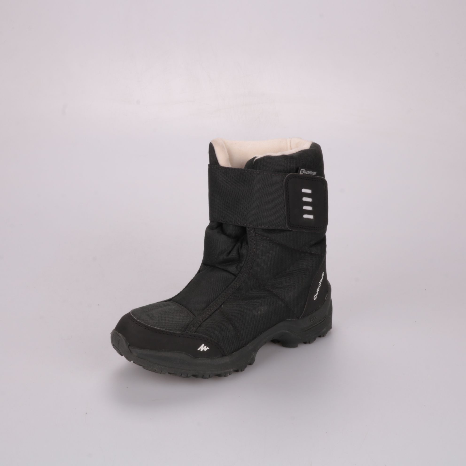 Зимние ботинки Quechua для мальчика, чёрного цвета, с утеплённой подкладкой и высоким голенищем. Подойдут для прогулок в холодную погоду и активных игр на улице. Широкая застёжка на липучке помогает быстро надевать и надёжно фиксировать обувь на ноге.