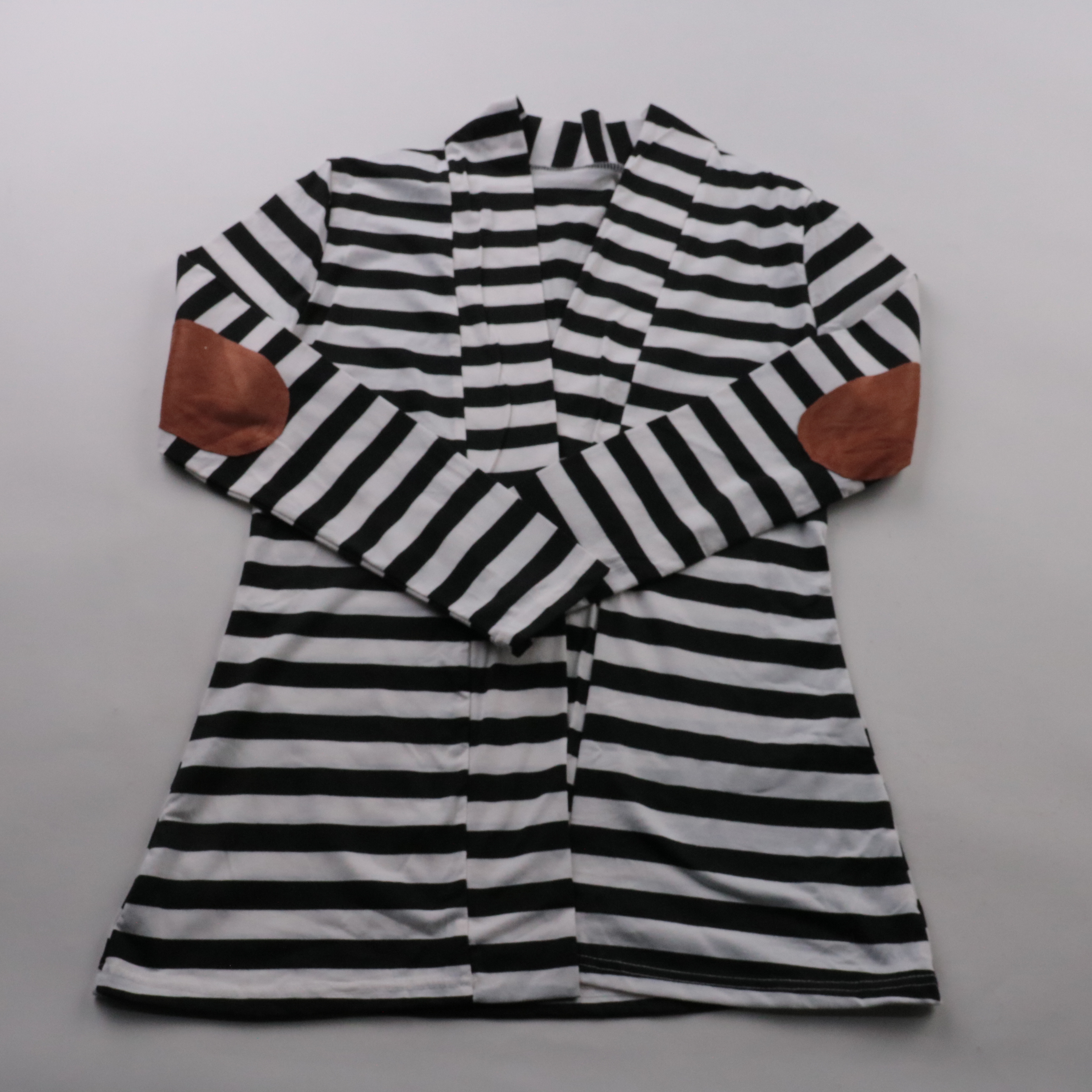 Кофта в черно-белую полоску с коричневыми налокотниками, подойдет для школы и повседневной носки в прохладную погоду. Материал смесовый (хлопок/полиэстер), поэтому она меньше мнется и быстрее сохнет после стирки.