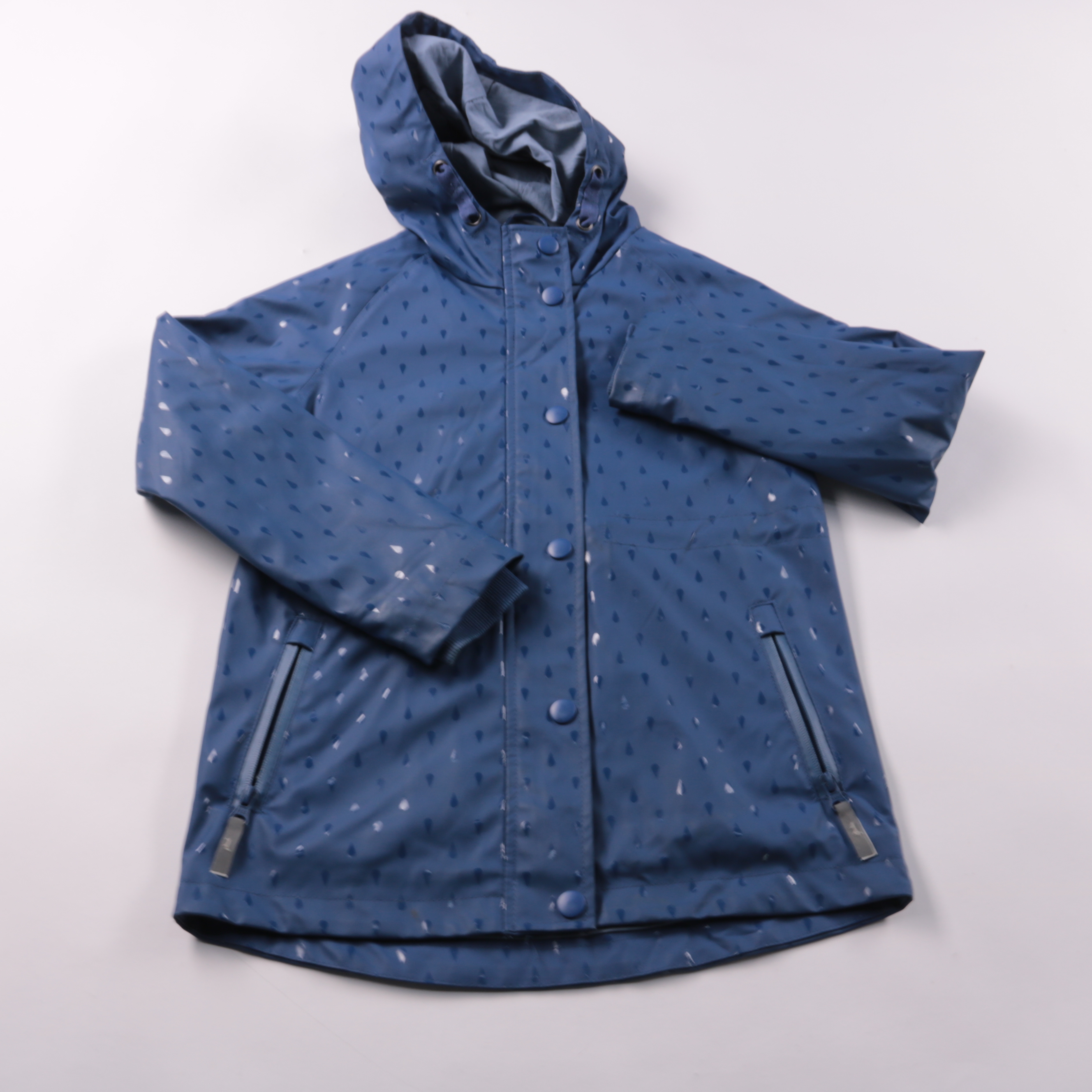 Ветровка Alive синего цвета с принтом, с капюшоном и застёжкой на кнопки. Подойдёт для прогулок в прохладную и дождливую погоду в межсезонье. Лёгкая, быстро сохнет и удобно стирается.