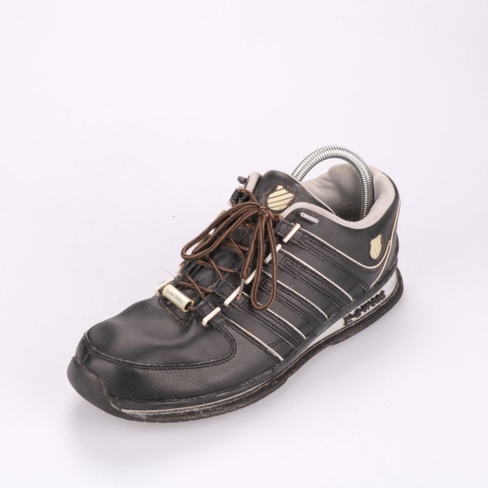 Мужские кроссовки K-Swiss в чёрном цвете с контрастной отделкой и удобной шнуровкой. Подойдут для повседневной носки и прогулок в городе, благодаря мягкому воротнику и устойчивой подошве. Практичный плюс — верх легко протирать и поддерживать в чистоте.