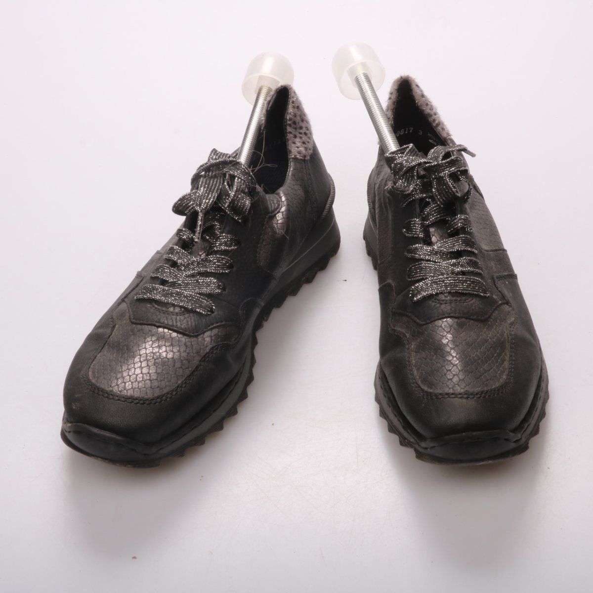 Кроссовки Rieker из чёрной кожи с фактурными вставками под рептилию и шнуровкой. Подойдут для повседневной носки в городе в демисезон и прохладные дни. Практичное преимущество — рельефная подошва даёт хорошее сцепление с поверхностью.