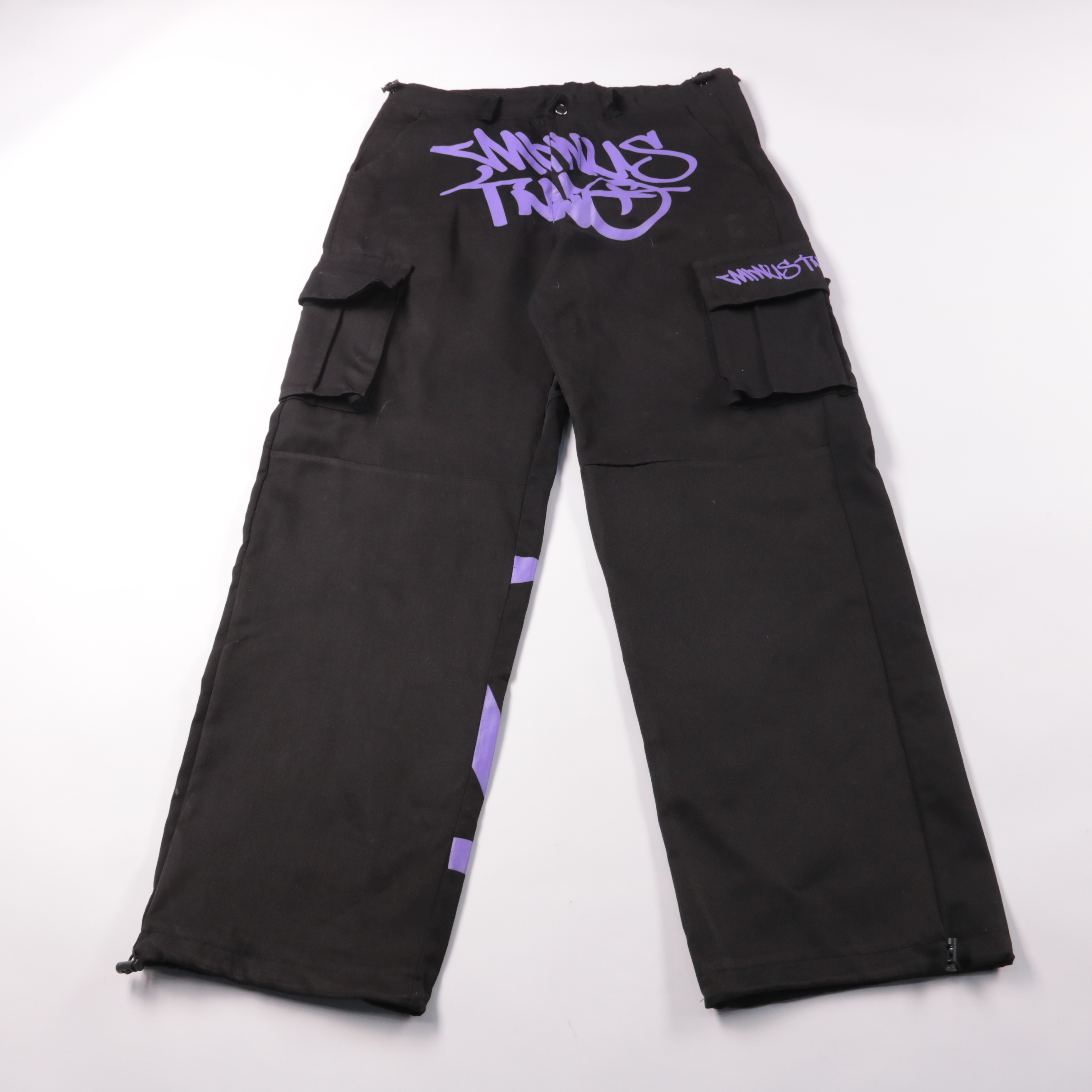 Чёрные брюки-карго с фиолетовым граффити-принтом и накладными карманами по бокам, подойдут для повседневных образов в уличном стиле. Удобная посадка и практичные карманы позволяют носить с худи, курткой или кроссовками и брать с собой мелочи без сумки.