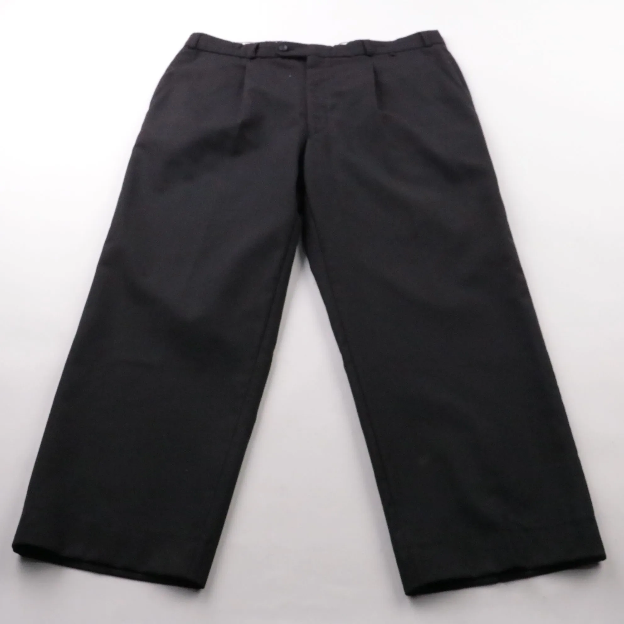 Классические мужские брюки чёрного цвета, бренд не указан. Прямой крой со стрелками подойдёт для офиса и официальных мероприятий. Натуральная шерсть хорошо держит форму и комфортна в носке.