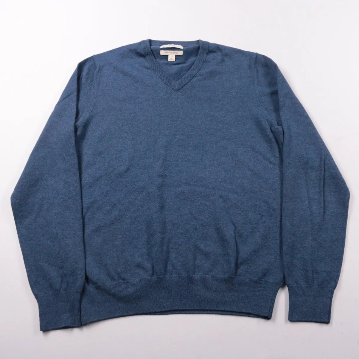 Мужской джемпер M&S из тонкого хлопка с V‑образным вырезом, спокойный синий оттенок. Подойдёт для офиса и повседневной носки, удобно надевать поверх рубашки или футболки. Практичный вариант: натуральный хлопок хорошо дышит и комфортен в помещении.